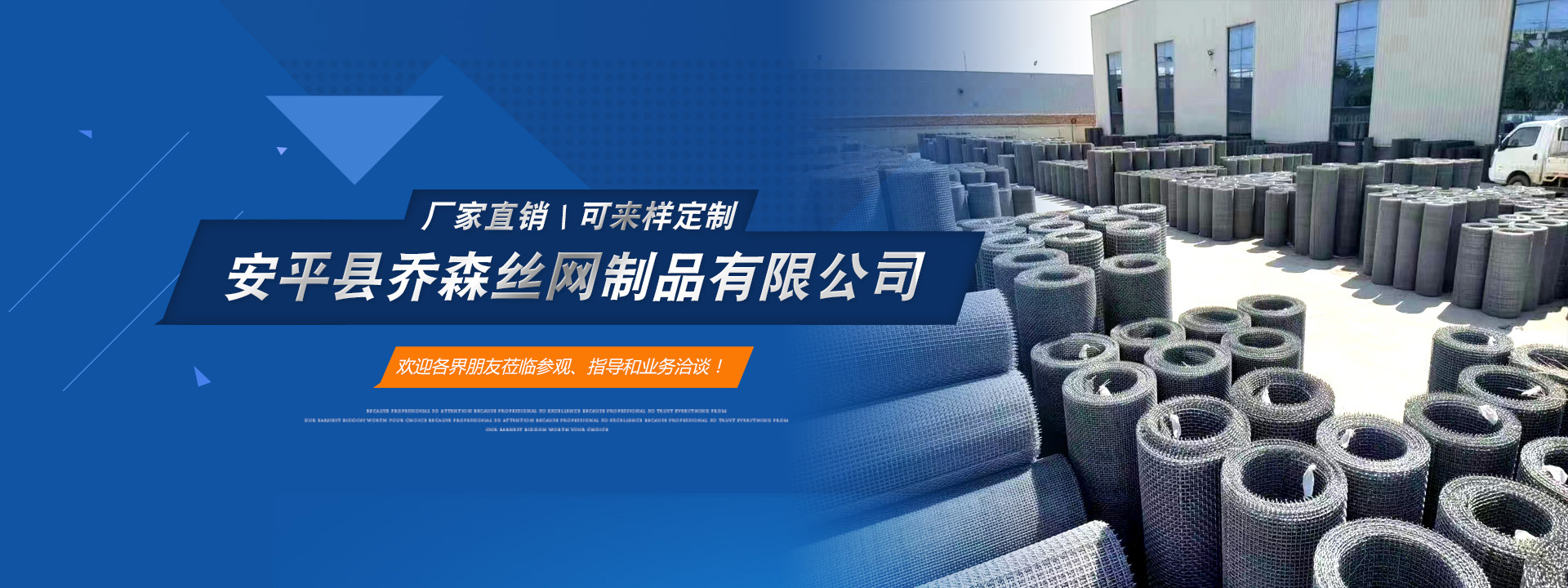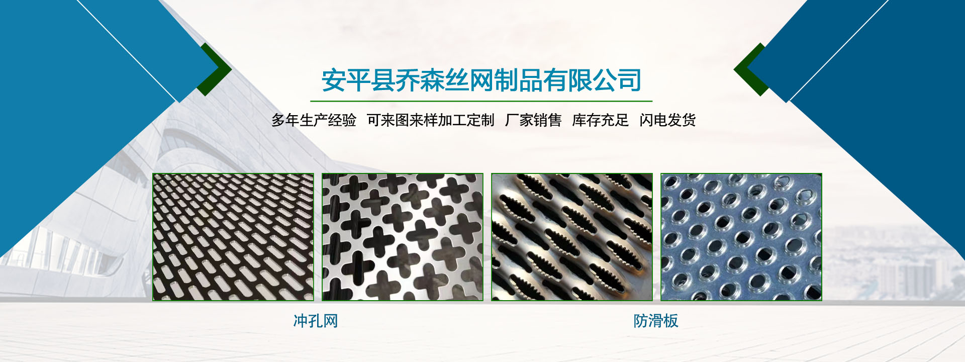 安平縣喬森絲網(wǎng)制品有限公司主營(yíng)產(chǎn)品:篩網(wǎng)、金屬裝飾網(wǎng)、沖孔網(wǎng)板、防滑板和軋花網(wǎng)。常年現(xiàn)貨供應(yīng)45號(hào)黑鋼絲編織篩網(wǎng)、熱鍍鋅鋼絲篩網(wǎng)、304不銹鋼篩網(wǎng)和冷鍍鋅鐵絲網(wǎng),加工定做耐磨65號(hào)錳鋼絲篩網(wǎng)、菱形孔防堵篩網(wǎng)、養(yǎng)殖用長(zhǎng)方孔鐵絲網(wǎng)、金屬裝飾網(wǎng)、盤條